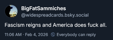 Something else I'm noticing is a concentrated attempt by people somewhere to sow defeatist thinking. I'll say it again and again: you're not cooked until you allow yourself to be. There's no scenario where these bastards succeed unless we allow them to. None. Nothing anyone in power right now does will stop me from criticizing them and advocating for the rule of law as written in our Constitution. Nothing.
