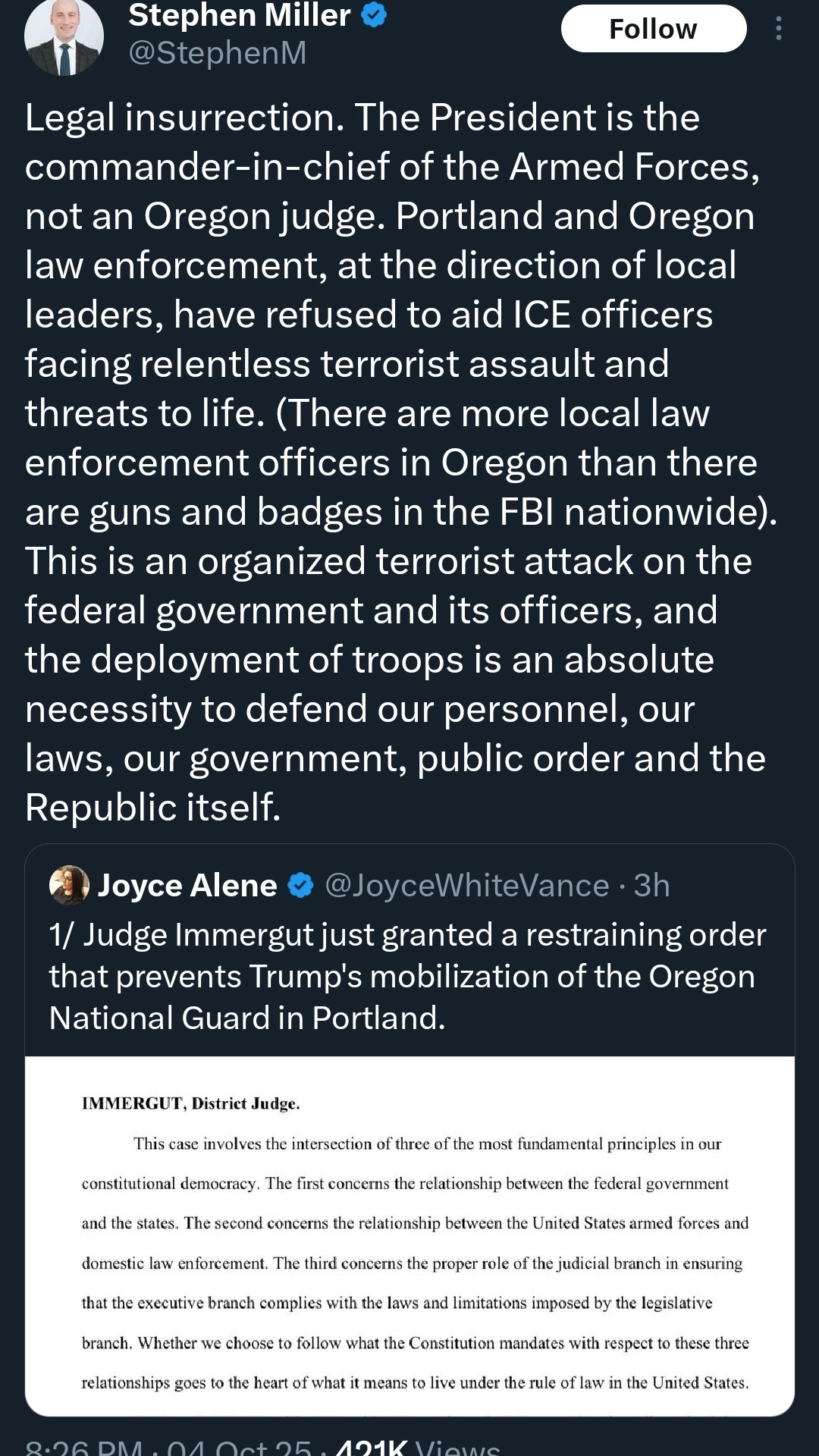 I'm trying to understand what a "legal insurrection" is. Last I checked, an insurrection is illegal by definition. In this fool's mind, law is treason if it defends against unchecked power. He sounds like a 7/11 vagrant rambling about the government. Also, he uses "terrorist" like a child that learned a new word. Imagine genuinely thinking that a judge making a ruling is "terrorism". What a dumbass. This is what he does though. He has tantrums online when he doesn't get his way. If anything, this seems to solidify my theory that he's the one responsible for these threats by Trump against Portland. What does he stand to gain from any of this? Does he have his hand up President Trump's ass like some kind of puppet? Probably, I mean, the guy's brain is jell-o at this point. All you gotta do is stroke his ego and the keys are yours. Anyway, I'm on a break, so posting time is limited. I guess stupidity doesn't take a break like I do, I'm so glad I caught this now, it made my night. He thinks he's enforcing law but he's actively decrying it at the same time. This is the definition of childish meltdown and I am here for it.