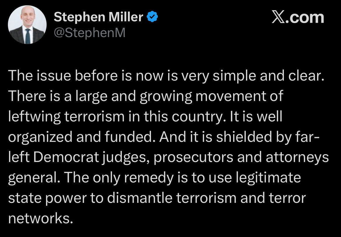 Oh course, there are no "left wing terrorists" wreaking havoc through the country. What he's refering to are protesters that are utilizing their first amendment rights. Looks like this guy has the same problems with the constitution that the rest of this administration are having. There is no legitimate power that exists that will quell protests. None.